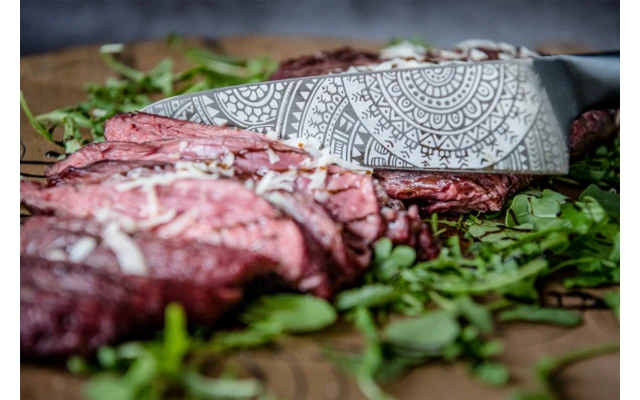 Rasiermesserscharfe Klinge (20 cm) aus rostfreiem 3Cr13-Stahl. Griff aus rostfreiem 420er Stahl mit geschwärzter Beschichtung (lebensmittelecht!). Die Härte der Klinge beträgt 52-54 Rockwell (HCR). Es wird empfohlen, das Messer von Hand zu reinigen (nicht in der Spülmaschine), um sicherzustellen, dass es seine Schärfe behält.