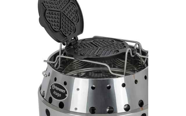 Eine ideale Draußen-Kochstelle, um das Wende-Waffeleisen zum Einsatz zu bringen, ist der Atago: Das Gestell des Waffeleisens passt optimal auf den oberen Rand. Gleichzeitig ist die Distanz zwischen dem Auflagegestell und dem Kohlerost groß genug, um die Waffeln mit indirekter Hitze backen zu können. Dadurch erzielst du beste Ergebnisse und hast ausreichend Abstand für geschickte Wendemanöver.