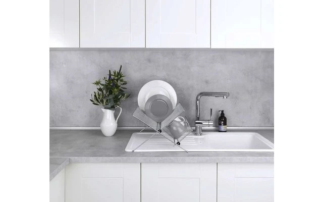 Der praktische Geschirrabtropfer Duo aus verchromtem Metall bietet mit seinen großen Ablageflächen viel Platz für Teller und Geschirr. Da es auch im Zeitalter der Spülmaschine immer noch Geschirr und Besteck gibt, das besser von Hand gespült werden sollte, dient er als funktionelles Zubehör für die Spüle in Küche, Gartenhaus oder Wohnmobil. Durch die kreuzförmige Konstruktion finden Teller auf der oberen Ablagefläche optimalen Halt. Die seitliche Ablage bietet Platz für Tassen, kleinere Gläser oder Besteck. Bei Nichtgebrauch kann der Geschirrabtropfer platzsparend zusammengeklappt werden.